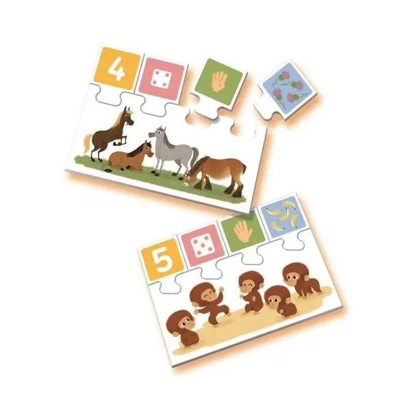 Dans ce jeu, l’enfant s’amuse à associer plusieurs représentations d’un même nombre : chiffre, constellation des points, nombre de doigts et collection. Les animaux et les illustrations colorées l’accompagnent tout au long du jeu. Grâce aux pièces de puzzle autocorrectives, il vérifie lui-même s’il a correctement regroupé les cartes entre elles.Ce jeu favorise ainsi l’apprentissage du champ numérique jusqu’à 10, la notion de quantité et ses différentes représentations. Dès 3 ans.