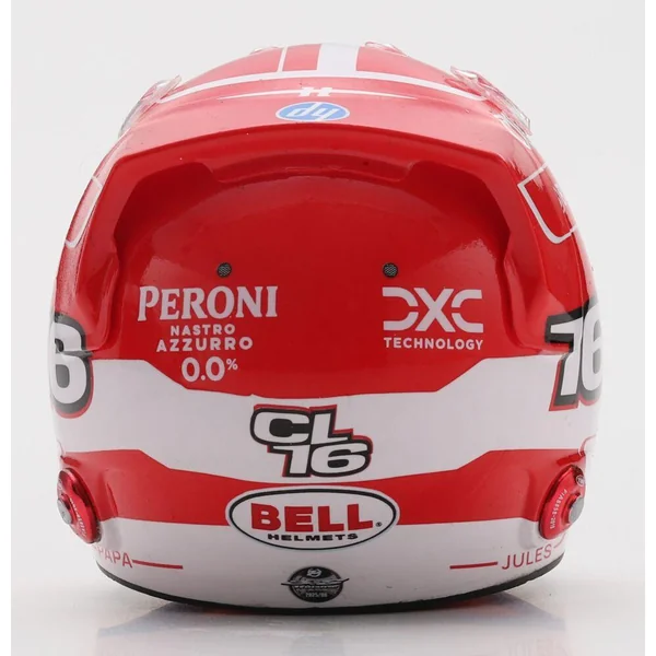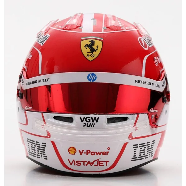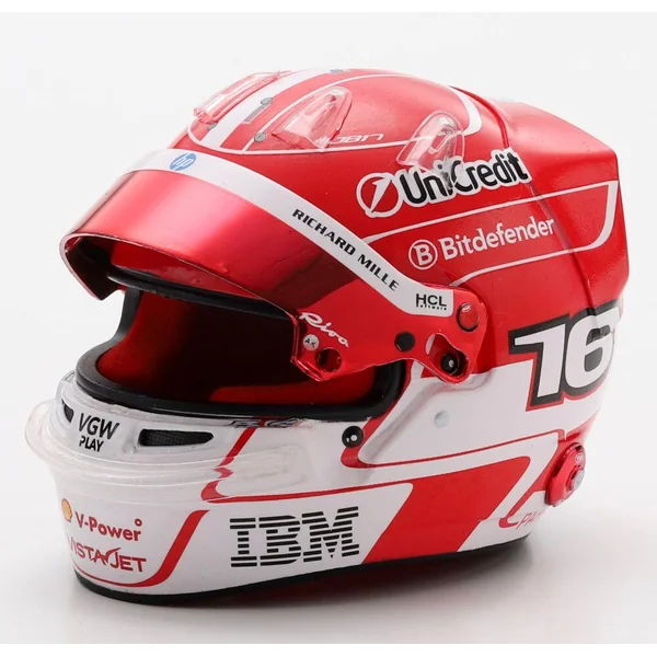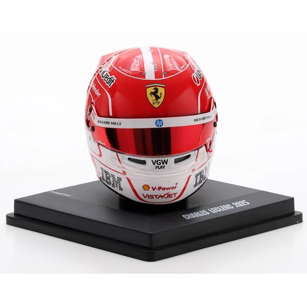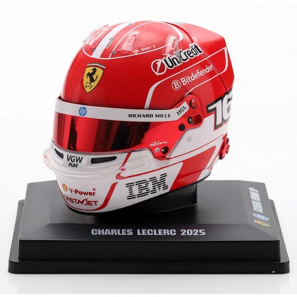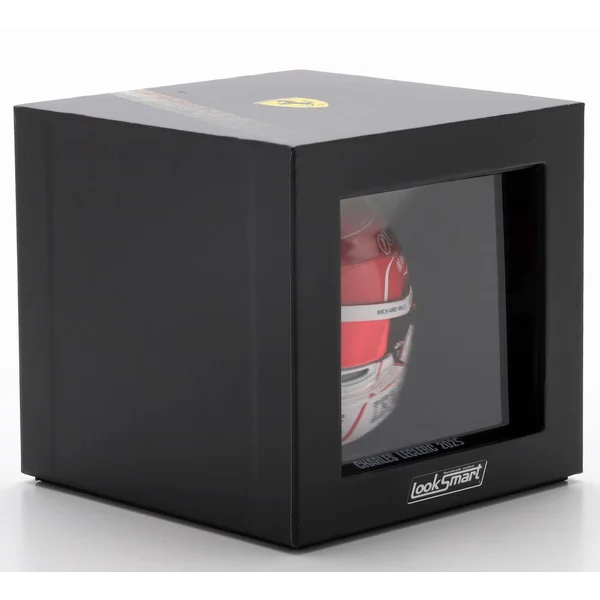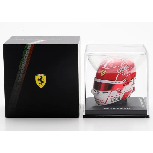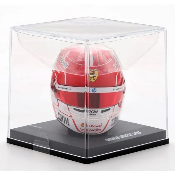 Casque de Charles Leclerc, pilote Scuderia Ferrari HP F1 2025. Casque à l’échelle 1/5 en injection plastique, présenté sur un socle reprenant la description du casque avec un capot de protection en plexiglass et une boîte en carton luxueuse ajourée. Le casque peut se désolidariser de son socle, la visière peut s’ouvrir et se refermer. Modèle ornemental à l’échelle 1/5 pour collectionneur adulte. Ne convient pas aux enfants de moins de 14 ans.