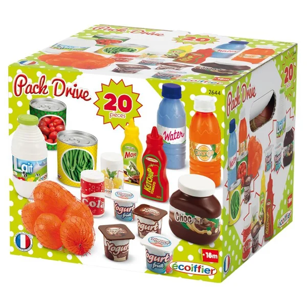 Ce pack contient l’essentiel des provisions : 1 bouteille d’eau, 1 bouteille de jus d’oranges, 1 bouteille de lait, du ketchup, de la mayonnaise, 2 boites de conserve, 1 pot de pâtes à tartiner, 4 yaourts, 2 sodas et 6 oranges.