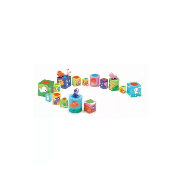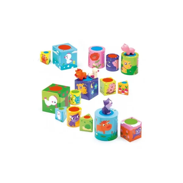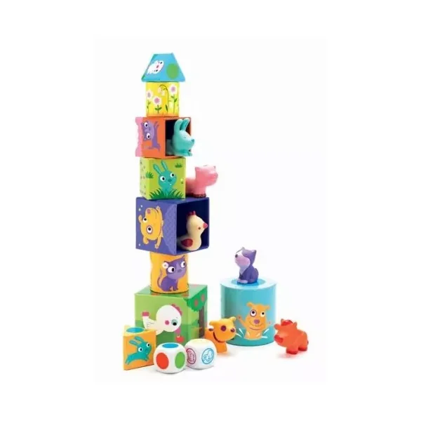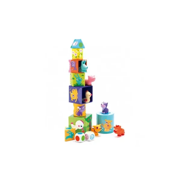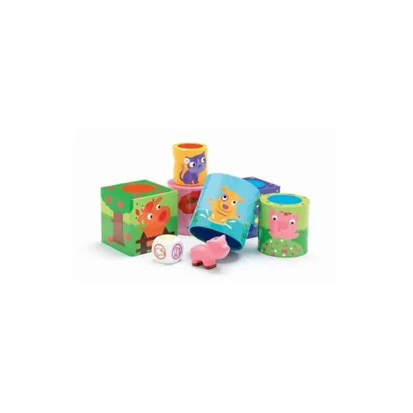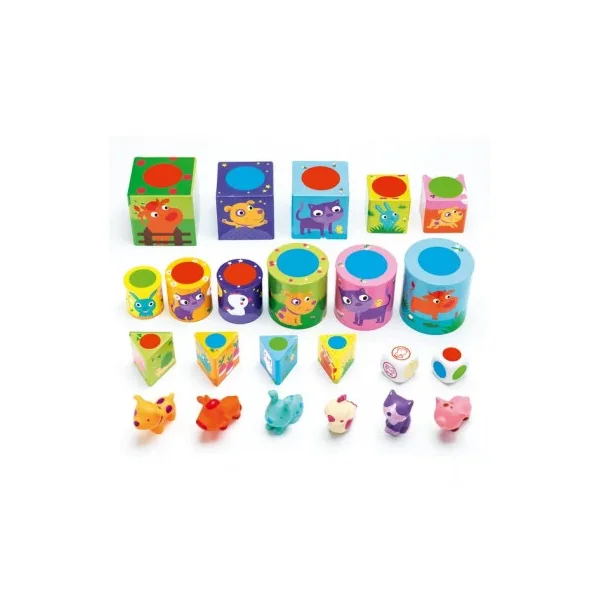 Le coffret se compose de 15 cubes de différentes formes et tailles, 6 animaux (chat, chien, cochon, lapin, vache et poule), 3 dés et une règle du jeu. Du matériel de qualité et résistant. Les figurines et les gros dés en plastique souple sont adaptés aux petites mains.