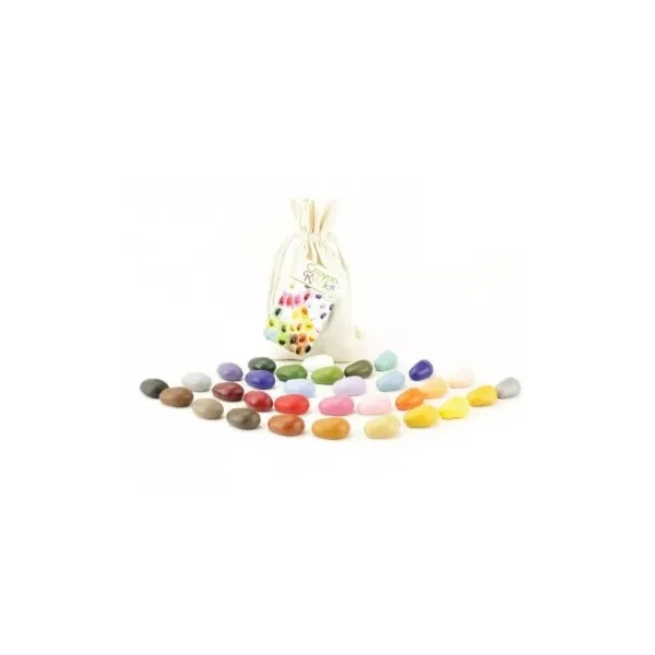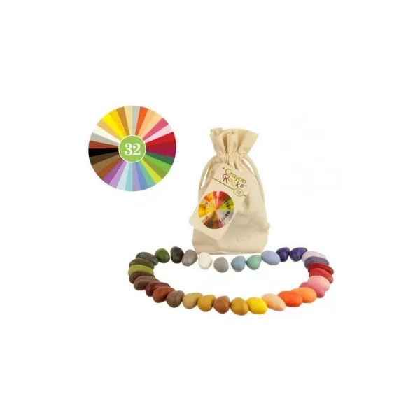 Découvrez les 32 crayons en cire naturelle de Crayons Rocks, 32 couleurs pour dessiner et colorier à partir de 3 ans dans un sac en coton. Ces crayons de couleur ergonomiques sont fabriqués avec de la cire de soja et des pigments naturels, une recette 100% naturelle.