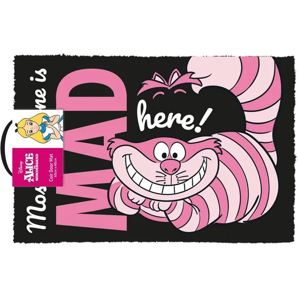 Disney. Alice au Pays des Merveilles. Tapis en fibre de coco 60 x 40 cm. Il est noté en anglais We’Re All Mad Here! (signifiant en français Nous sommes tous fous ici!).