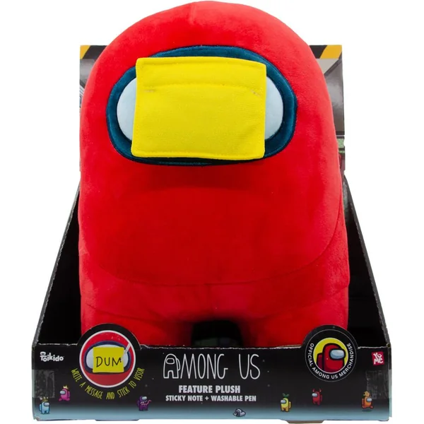 Peluche Among Us de 30 cm avec un sticky note (note repositionnable avec velcro) et un feutre lavable. Ecris un message et colle-le à la visière. Peluche douce au toucher en velboa. Lavable uniquement en surface avec un chiffon humide. Matériaux : polyester. Rembourrage : fibre de polyester, granulés. Coloris existant : uniquement en rouge.
