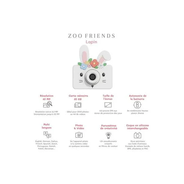 Découvrez l’appareil photo Lapin fleurs de la collection Zoofriends de The Zoofamily, un appareil photo numérique fun et amusant, qui émerveillera les enfants de 3 à 7 ans avec sa qualité d’image exceptionnelle et sa touche de fantaisie.
