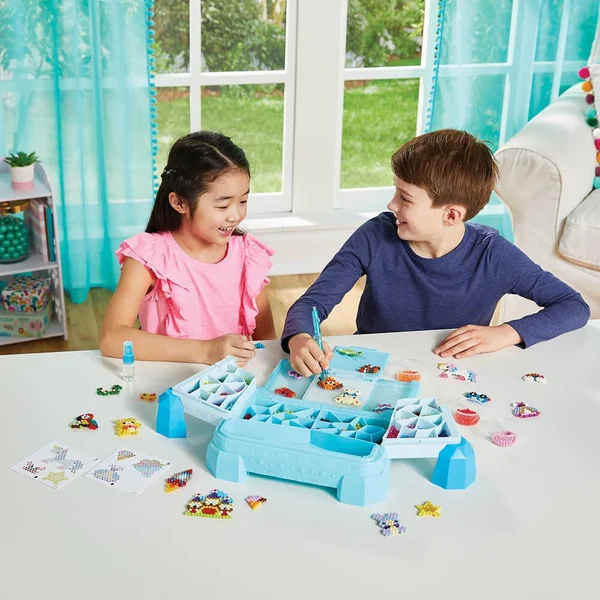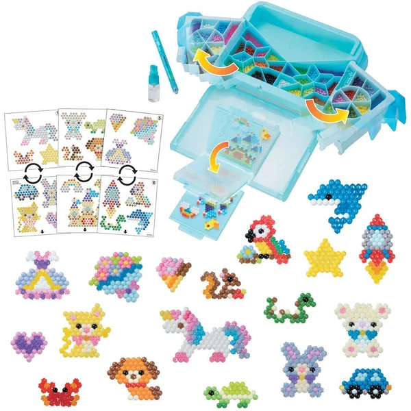 Deviens un véritable artiste avec ton grand atelier de création Aquabeads et crée à l’infini pour jouer, offrir ou décorer ta chambre ! Le principe est simple : assemble les perles, vaporise de l’eau, retourne ta création à l’aide du Flip Tray et c’est prêt ! Il contient des perles de différentes formes (dont les perles étoiles) et couleurs, le Flip Tray, un trieur de perles totalement inédit et l’essentiel pour des heures de créativité avec Aquabeads