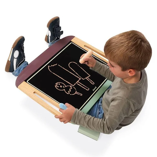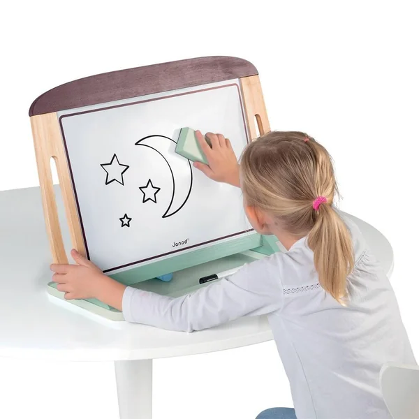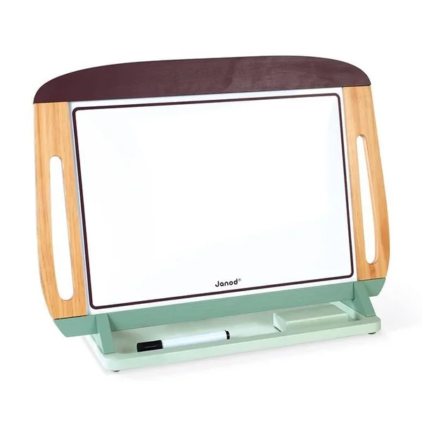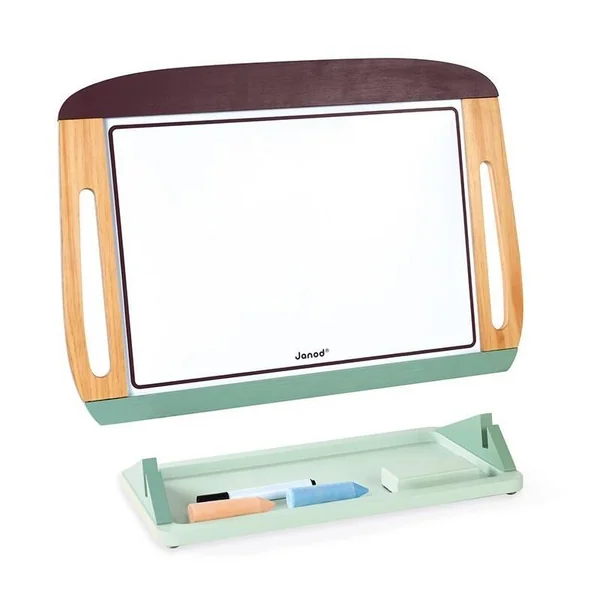 2 faces, 1 pour écrire à la craie et une face blanche magnétique. Livrée avec deux craies, un feutre effaçable et une brosse. Pose-la où tu veux, grâce à son support anti-dérapant !