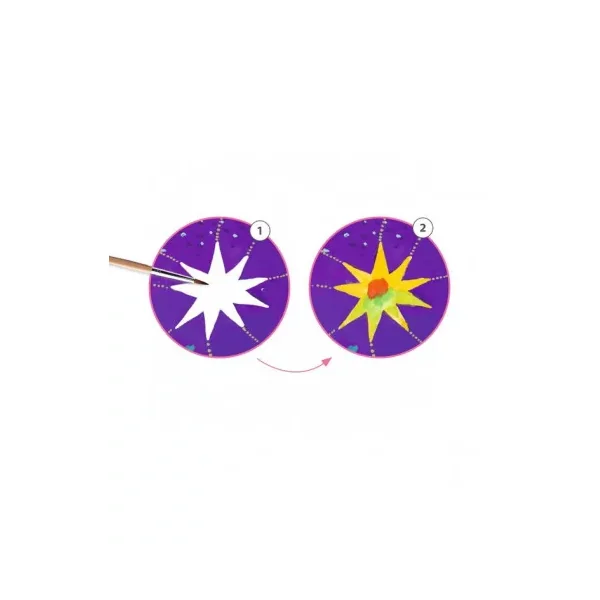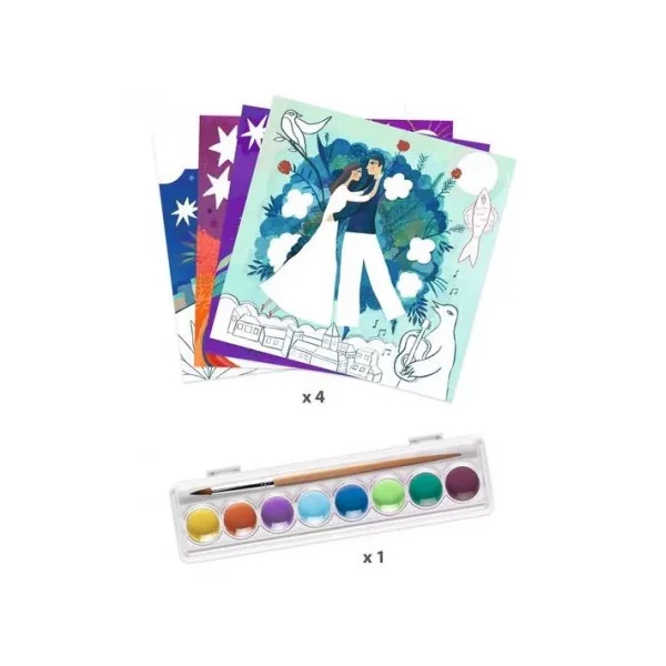 Le coffret contient 8 cartes illustrées (4 modèles x 2), 1 palette de gouaches de 8 couleurs, 1 pinceau et 1 livret d’explications pas à pas en couleurs.