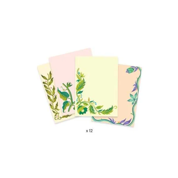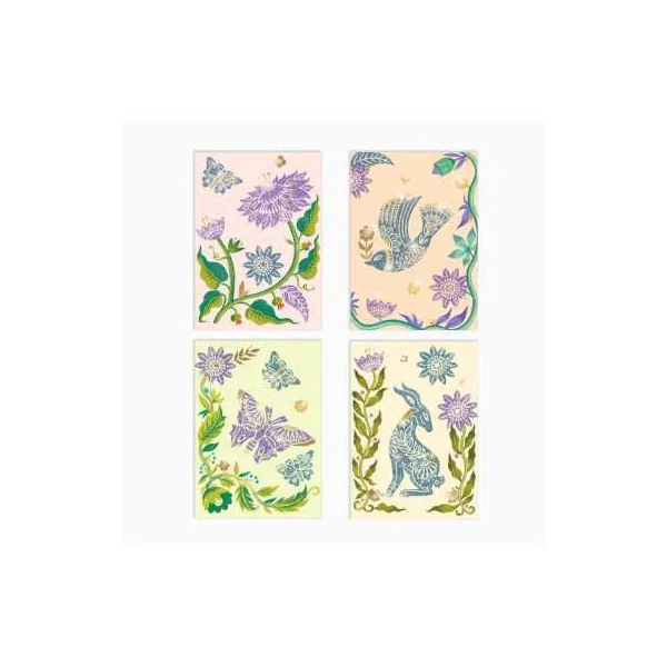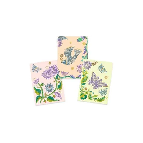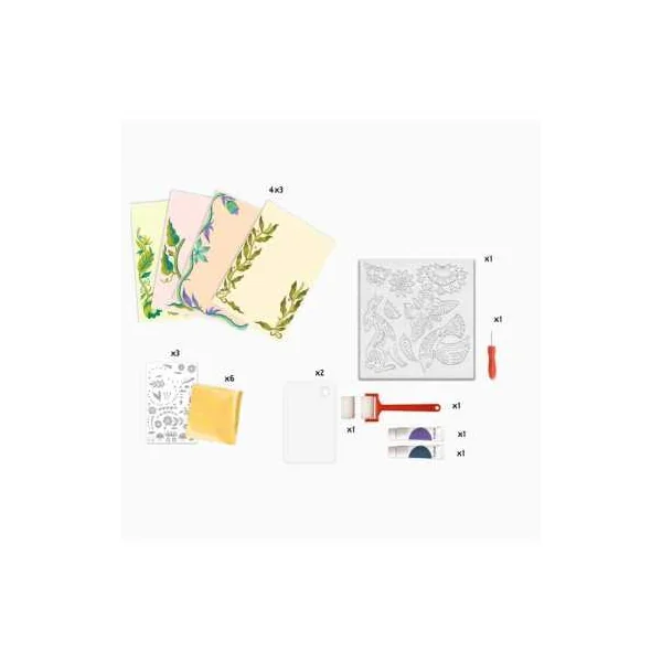 Ce coffret contient 12 cartes, 8 tampons à graver, 1 poinçon, 2 tubes de gouache, 2 rouleaux de peinture en mousse, 2 palettes, 3 feuilles de papier métallisé et 3 planches de motifs à métalliser.
