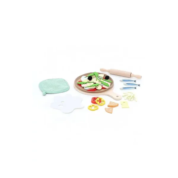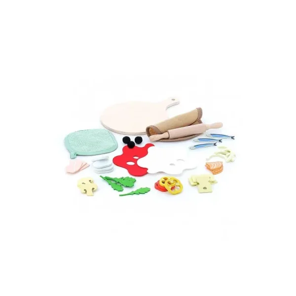 Le coffret contient 1 planche en bois, 1 pâte en tissu, plus de 40 ingrédients en bois et feutrine, 1 rouleau à pâtisserie et 1 manique.