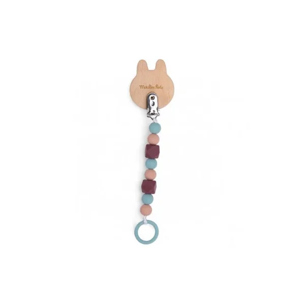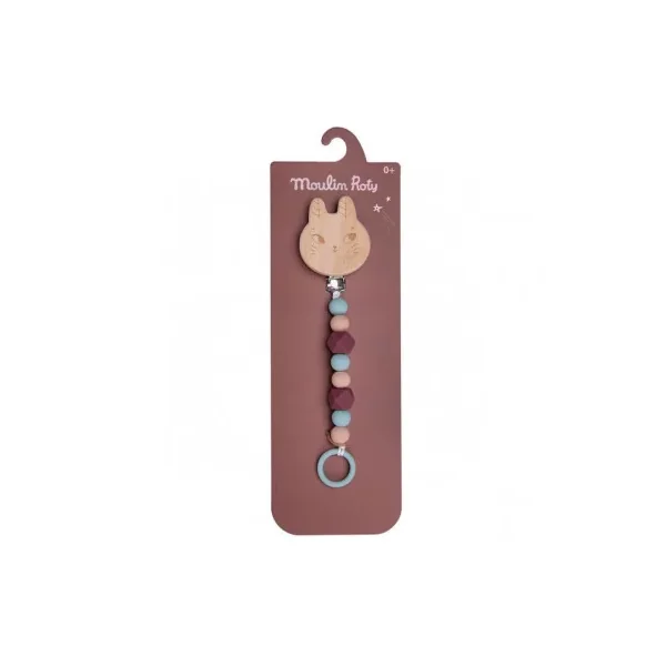 Un attache-tétine lapin en bois et silicone pour ne plus perdre la sucette de bébé. Il s’attache facilement à tout support grâce à son clip ajustable. Les perles de silicone sont sans danger pour bébé, il pourra jouer avec et les mâchouiller.