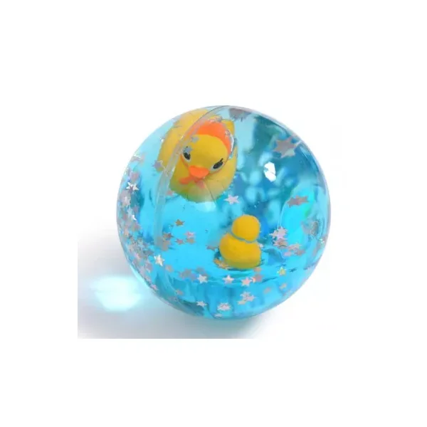 Balle rebondissante remplie de liquide coloré, où l’on voit un canard se baigner au milieu d’étoiles brillantes
