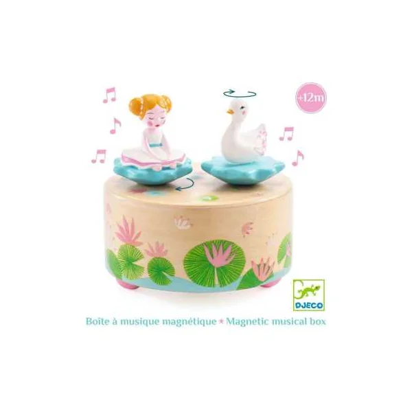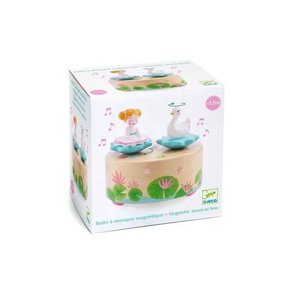 Une magnifique boîte à musique magnétique joliment illustrée avec deux figurines ballerine et cygne. Il suffit de remonter la clé et les figurines se mettent à tourner et à danser au son de la musique « Le lac des cygnes » de Piotr Ilitch Tchaïkovski.