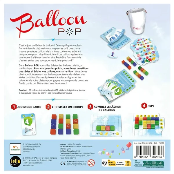 « Balloon Pop » est un jeu dynamique où les joueurs éclatent des ballons pour marquer des points. Sur 8 tours, vous constituez des séries de ballons de même couleur ou avec un symbole, les éclatez pour marquer et faites remonter d’autres ballons, créant ainsi de nouvelles séries. Planifiez stratégiquement pour former des séries parfaites, vider lignes et colonnes pour maximiser vos points, et flottez vers la victoire. C’est un mélange excitant de stratégie, de chance, et d’anticipation tactique.