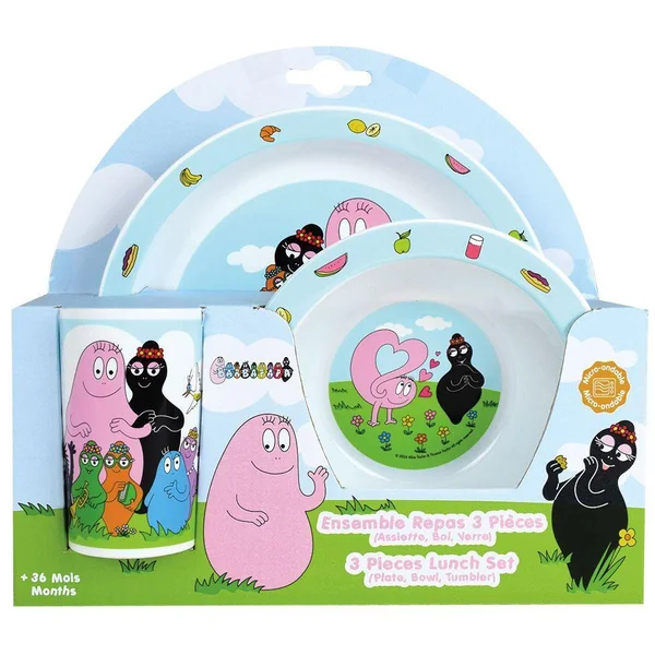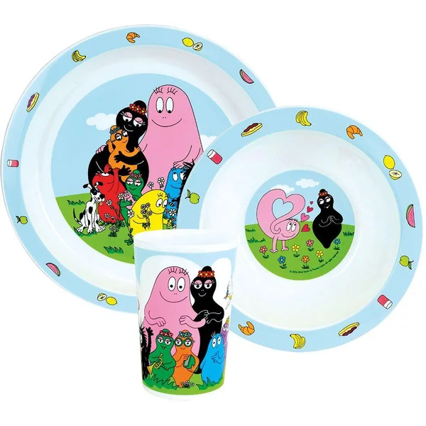 Votre enfant sera ravi de retrouver la célèbre famille des BARBAPAPA au moment de passer à table ! Cet ensemble repas spécialement conçu pour les enfants comprend une assiette plate, un bol et un verre ! Ce coffret est idéal pour que le repas soit un moment rempli de gaité en compagnie de BARBAPAPA, BARBAMAMA, BARBOUILLE, BARBALALA, BARBIDUR, BARBOTINE, BARBIBUL, BARBABELLE et BARBIDOU !