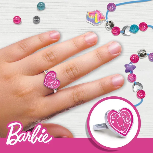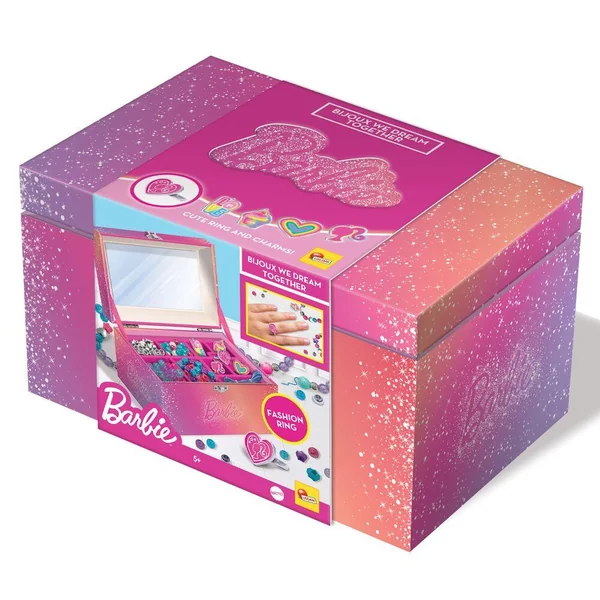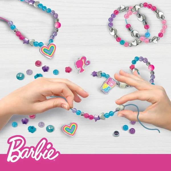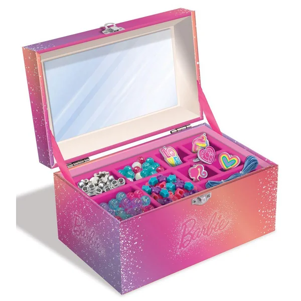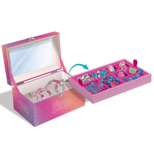 BIJOUX BARBIE WE DREAM TOGETHER, Cette magnifique boîte à bijoux Barbie, avec compartiment amovible, miroir et fermoir en métal, contient une sélection de perles et de breloques pour fabriquer les bracelets et les colliers de Barbie ! Une fois vos bijoux réalisés, vous pouvez les ranger à l’intérieur..