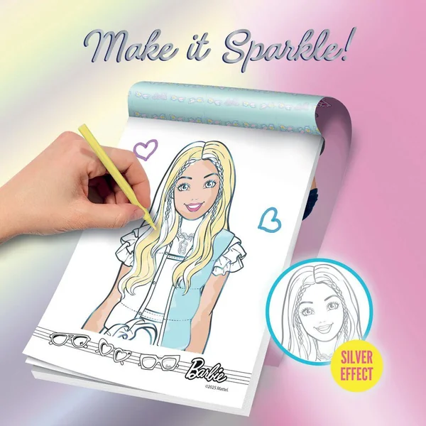 LIVRE DE COLORIAGE BARBIE ECLAT, Découvre le nouveau carnet de croquis holographique de Barbie. Amuse-toi à colorier toutes les images avec l’effet holographique à l’intérieur..