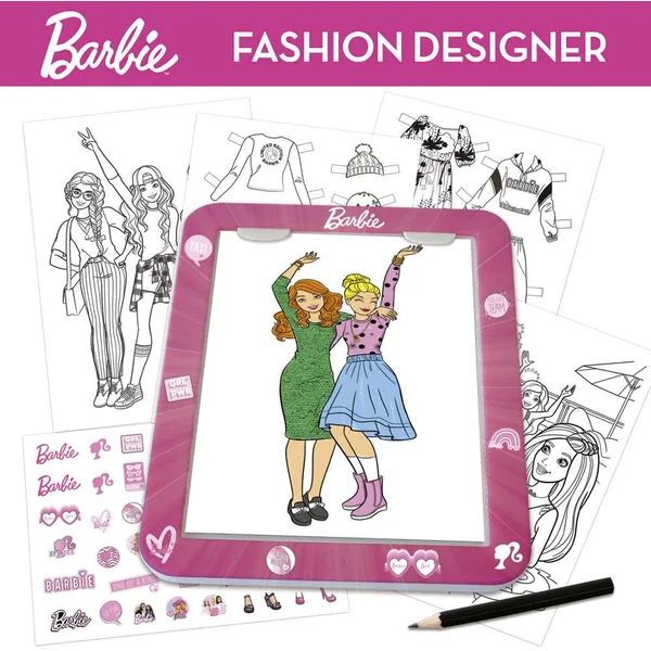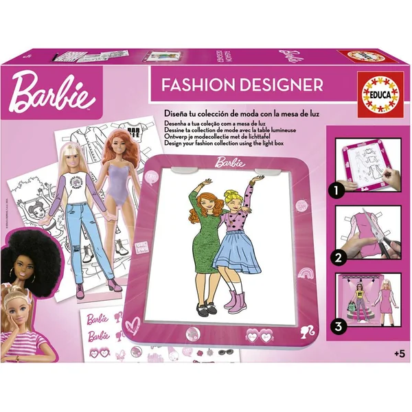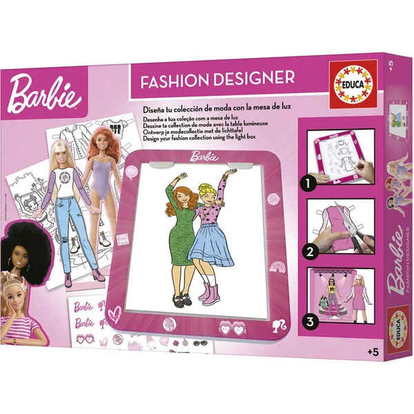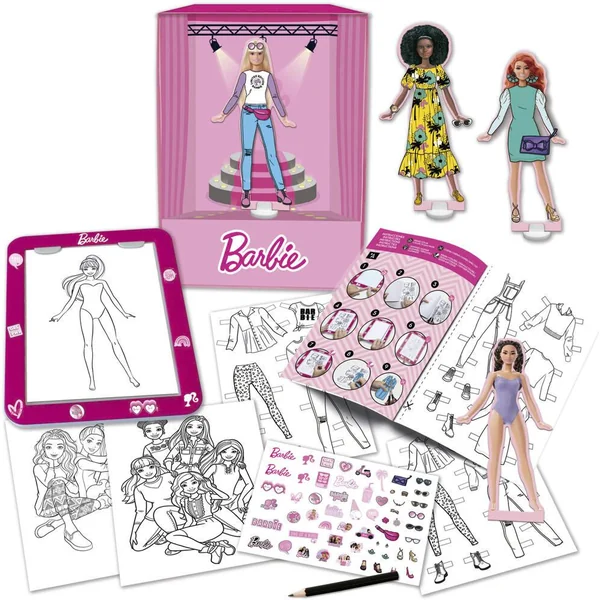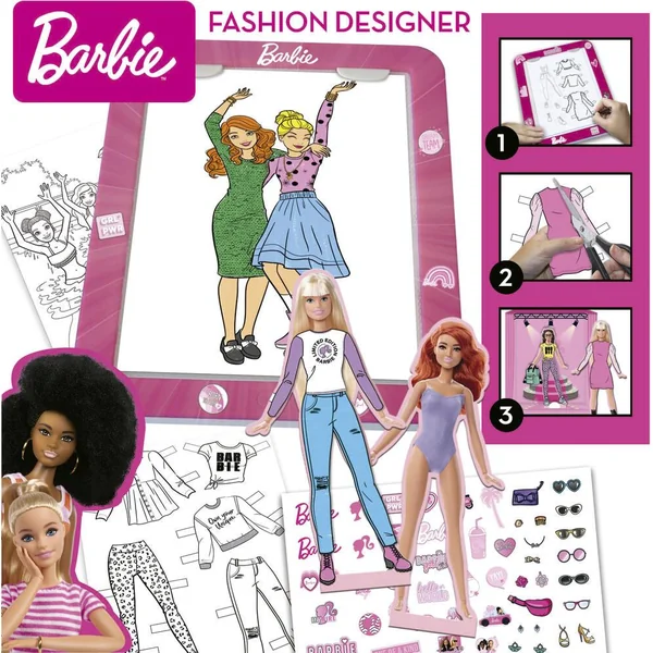 Crée tes dessins de Barbie avec la table lumineuse et personnalise-les avec les autocollants ! Décalque-le modč,le de ton choix, sur la table lumineuse c´est trč,s facile ! Colorie-ton dessin comme tu en as envie, puis tu peux le personnaliser avec les autocollants. Contient : 1 table lumineuse, 1 livret de 32 pages de modč,les, motifs et instructions, 1 crayon de papier, 1 feuille d´autocollants, 4 bases blanches, 4 figurines Barbie en carton et l’intérieur de l’emballage qui se transforme en passerelle. Nécessite 3 piles AAA (non incluses). Pour les 5 ans et plus.