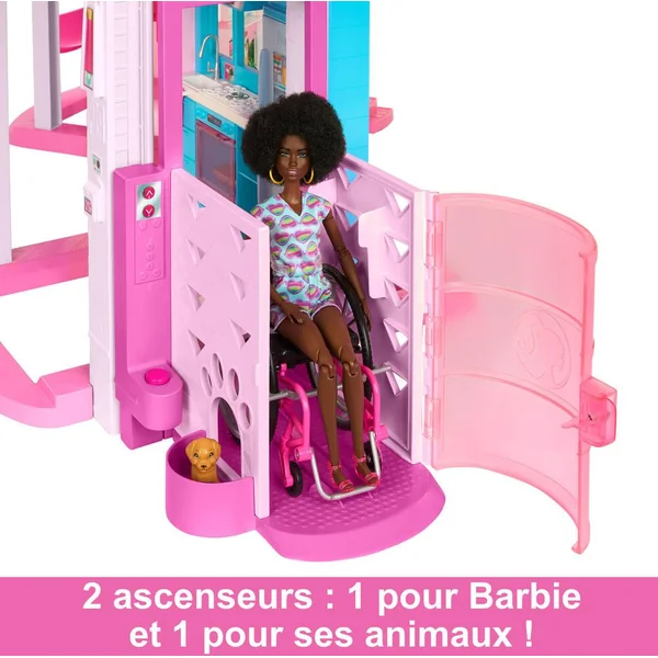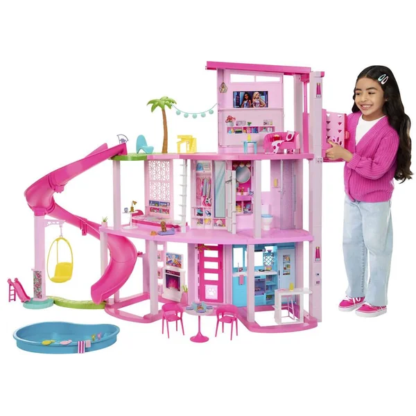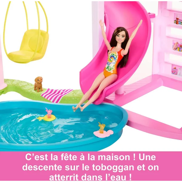 Cette maison de poupée de luxe possède le toboggan le plus grand à ce jour de la gamme Maison de Rêve de Barbie®, avec un design en spirale sur trois niveaux pour s’amuser toute la journée au soleil. Profitez d’une zone de jeu à 360 degrés avec cette maison spacieuse à trois niveaux et 10 espaces de vie intérieurs et extérieurs. Le coffret comprend également de nouveaux éléments pour les animaux de compagnie, y compris un toboggan pour chiot et une piscine où nos amis à poils pourront s’amuser avec la poupée Barbie® !