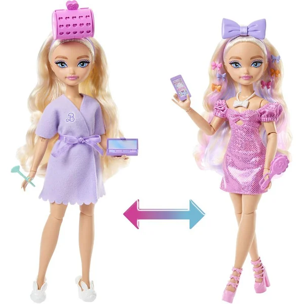 Aidez Barbie ‘Malibu’ et Barbie ‘Brooklyn’ à se préparer pour une soirée amusante. Elles sont tellement glam ! La poupée Barbie ‘Malibu’ Dream Besties Soirée en Ville encourage les enfants à s’exprimer en s’amusant. Barbie se détend en robe de chambre avec son masque en concombre pour les yeux. Aidez-la à se préparer pour une soirée en ville ! Ouvrez ses bigoudis pour découvrir des surprises amusantes, comme de la craie pour cheveux et un grand nœud ! Barbie peut porter sa robe de chambre pendant qu’elle coiffe ses cheveux, puis enfiler sa robe étincelante pour se préparer à partir. Apportez une touche finale au look de Barbie avec sa palette de maquillage et ses pinceaux ! Les poupées Barbie Dream Besties invitent les enfants à partir de 4 ans à réaliser leurs rêves. La poupée ne tient pas debout toute seule. Les couleurs et les décorations peuvent varier.