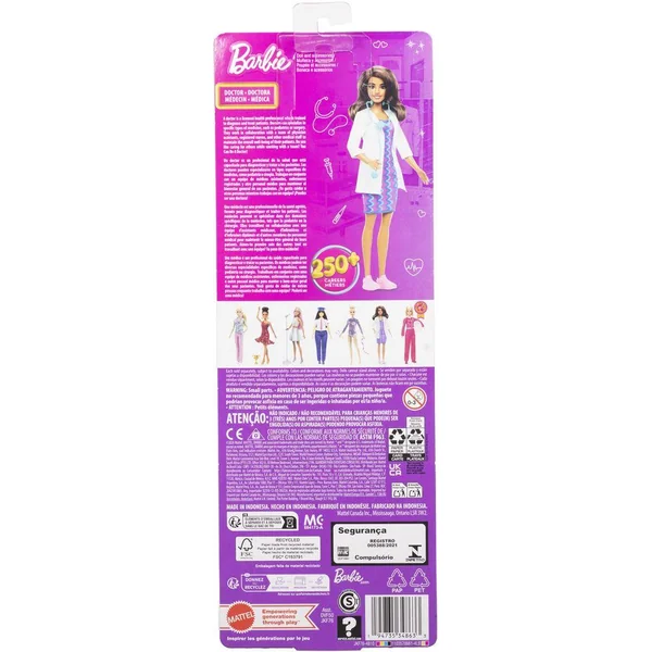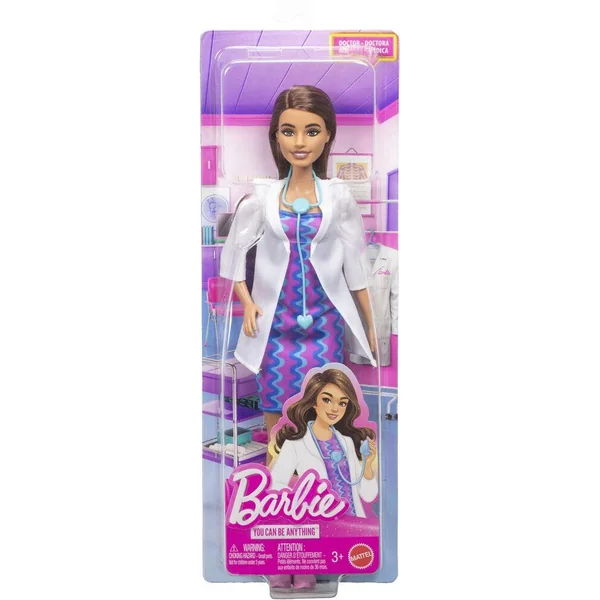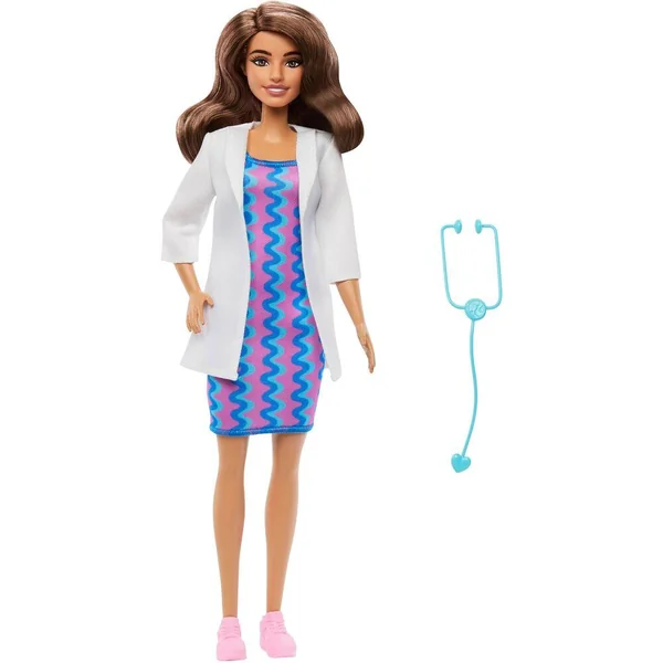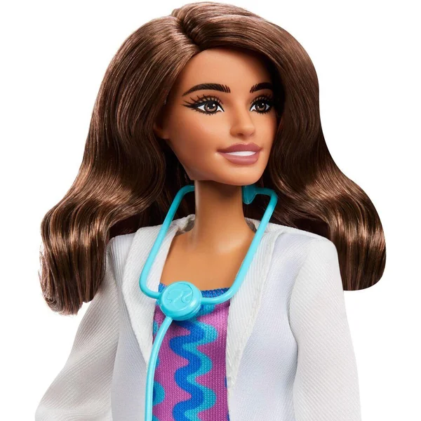 Avec 1 stéthoscope autour du cou, Barbie accueille ses patients ! Elle porte une robe bleue et violette et une blouse blanche.