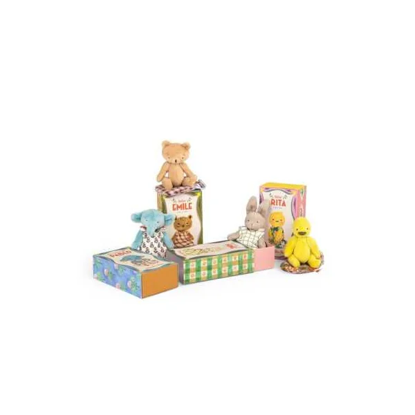 Chaque bébé Minouchka est accompagné d’une jolie boite illustrée dévoilant au dos son jouet préféré.