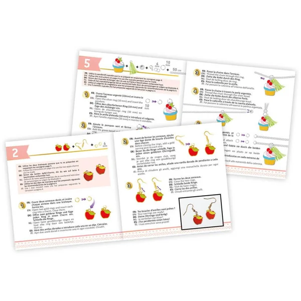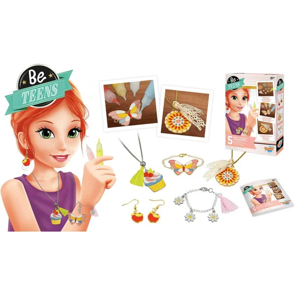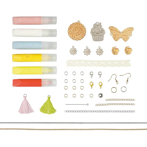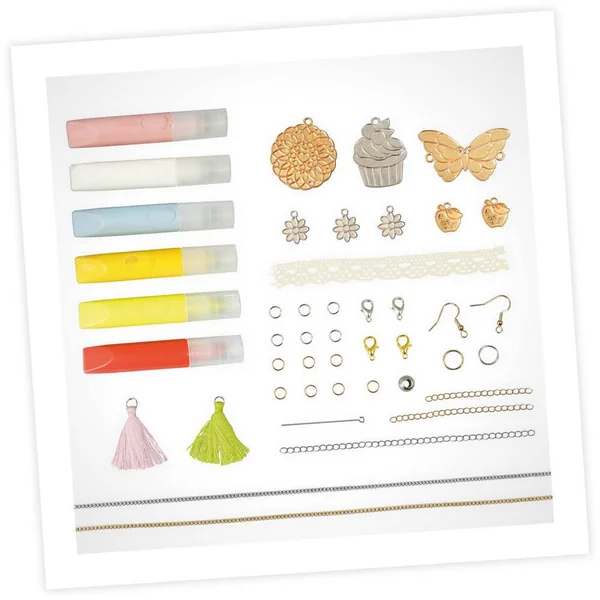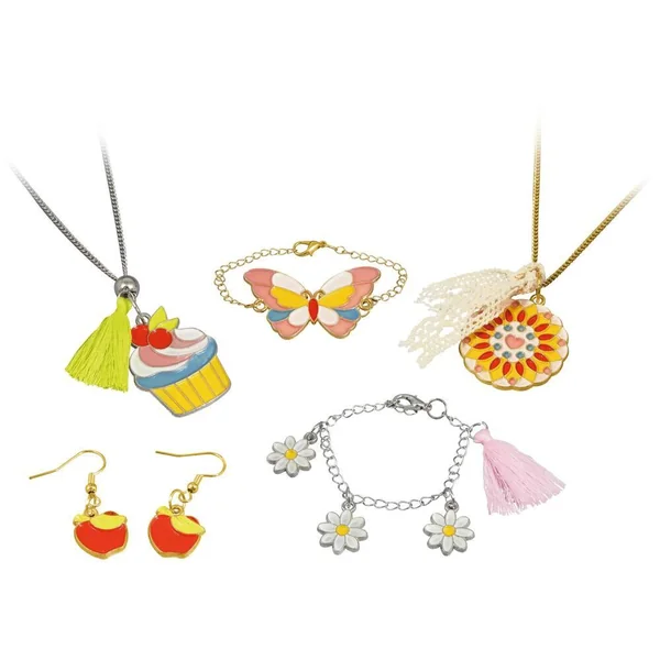 Remplis les breloques en métal de peinture pour créer des bijoux colorés ! La peinture sèche à l’air libre. Crée 2 colliers, 2 bracelets et une paire de boucles d’oreilles. Contient : breloques en métal, tubes de peinture, ruban, pompons, perle, chaînettes… Notice illustrée en couleurs.