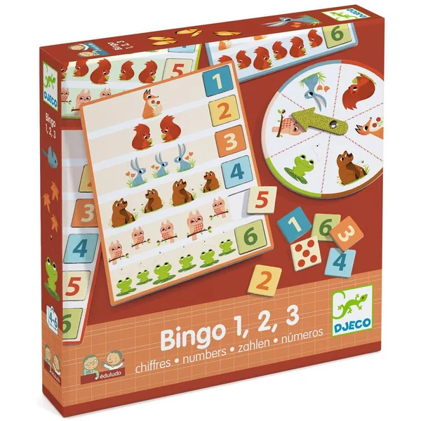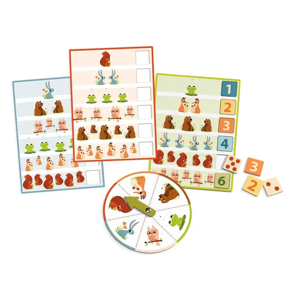 Le bingo est jeu d’association et de collecte sur la thématique des chiffres et des animaux de la forêt. Chaque joueur choisit une planche qu’il pose devant lui. Les jetons et la roue sont placés au centre de la table. Le joueur le plus jeune commence et fait tourner la roulette. Il prend parmi les jetons celui indiqué par la roulette et le place sur sa planche. On passe au joueur suivant et ainsi de suite. Le premier à avoir complété sa planche gagne.