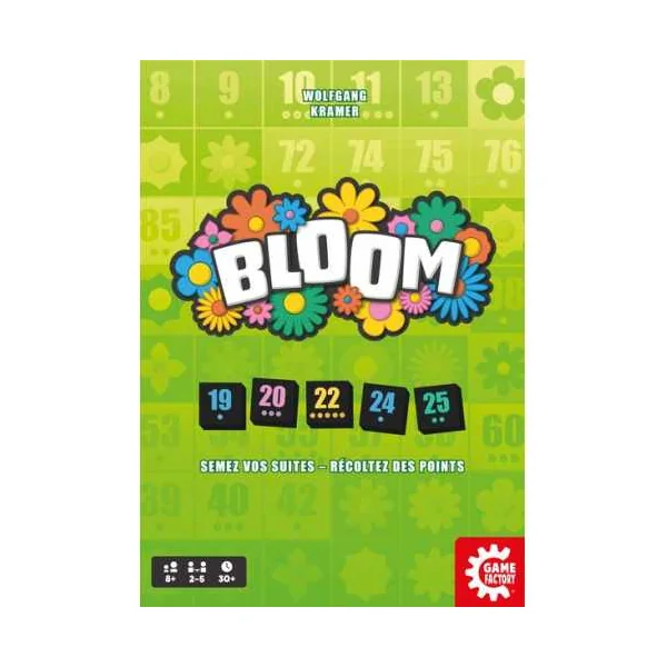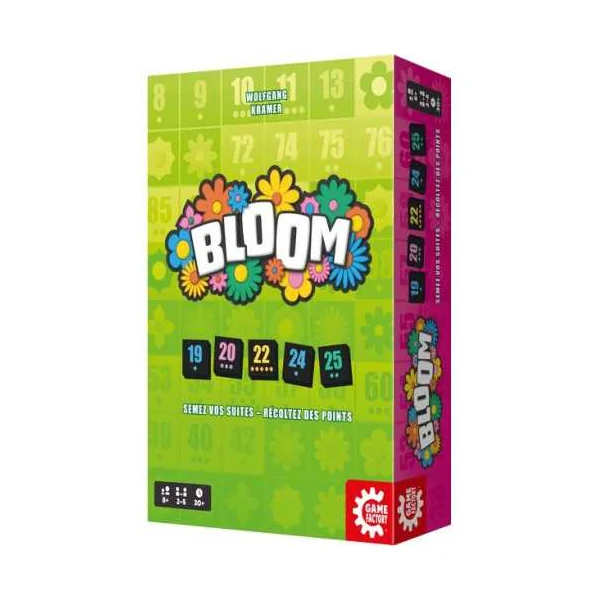 Imaginé par Wolfgang Kramer, auteur primé et figure incontournable du jeu de société moderne, Bloom propose une expérience dynamique où il faut former les plus belles suites de tuiles numérotées pour marquer un maximum de points en seulement deux manches.