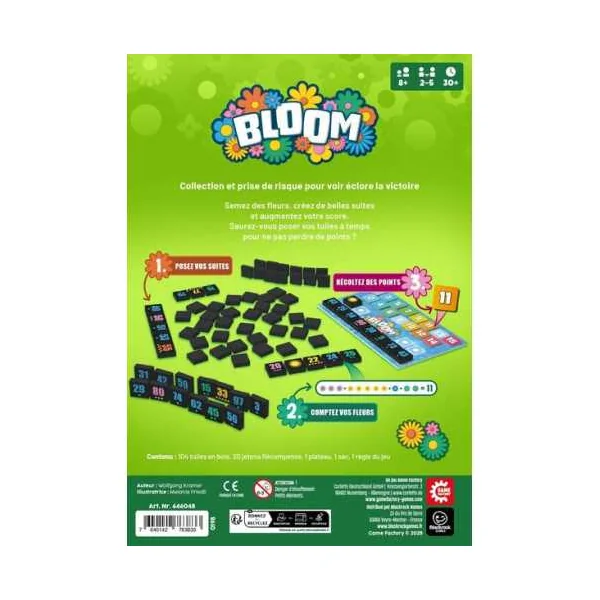 Dans Bloom, chaque choix compte : poser ses tuiles pour marquer rapidement des points ou en piocher d’autres pour viser une suite plus lucrative ? Assemblez des suites numériques astucieuses, volez des tuiles à vos adversaires, optimisez vos poses pour récupérer les jetons les plus convoités. Plus vos suites comptent de fleurs, plus vous marquez. Mais attention à ne pas trop garder en main : chaque fleur non posée vous coûtera cher! Grâce à une prise en main rapide, une tension constante et des interactions malicieuses, Bloom offre une expérience aussi accessible que stratégique, entre planification, opportunisme et prises de risques calculées.
