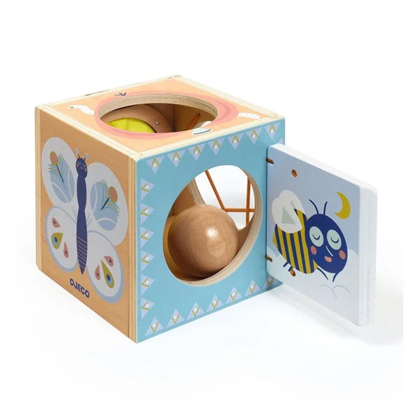 BabyBox est une boîte à cache-cache en bois brut et aux couleurs pastel, destinée aux enfants à partir de 10 mois. L’enfant choisit l’un des trous pour cacher la balle à l’intérieur de la boîte : à travers les élastiques, en ouvrant la petite porte, en la passant par le grand trou, ou encore par le grand tissu élastique, surprise: la balle disparait. Puis, il la récupère et recommence. L’enfant découvre 4 manières différentes de cacher la balle dans la boîte.