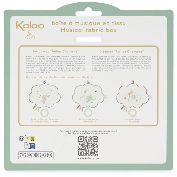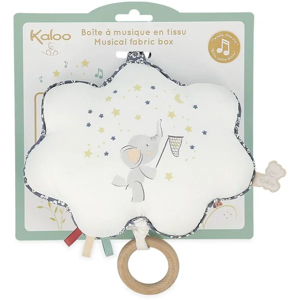 Animez la marionnette au son de la musique pour partager un moment privilégié avec bébé. Que la découverte commence ! La boîte à musique en tissu délicatement imprimée et brodée sur le thème de « Brille Brille Petite étoile » est un élément phare pour le développement de bébé. En effet, si vous tirez sur l’anneau en bois au bout de la ficelle, vous entendrez la comptine « Brille, Brille, Petite étoile » afin de pouvoir la chanter à bébé. Sa petite taille de 12 cm et son ruban permet de l’emporter et l’accrocher partout. Le boîtier musical est étanche donc vous pouvez facilement le laver à la main sans risques. Kaloo, partenaire des premiers instants présente une gamme de coussins musicaux et de marionnettes. Les comptines accompagnées de gestes stimulent le langage, l’attention, la curiosité mais aussi le développement moteur des tout-petits.