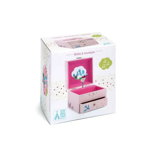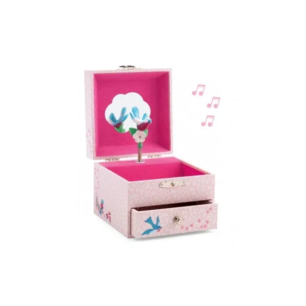 Une petite boite à musique Djeco avec tiroir où un oiseau pinson se mettra à danser lorsque vous actionnerez la musique. Le tiroir et le compartiment lui permettront de ranger bijoux, trésors et secrets… et de s’admirer dans le petit miroir devant lequel danse l’oiseau.