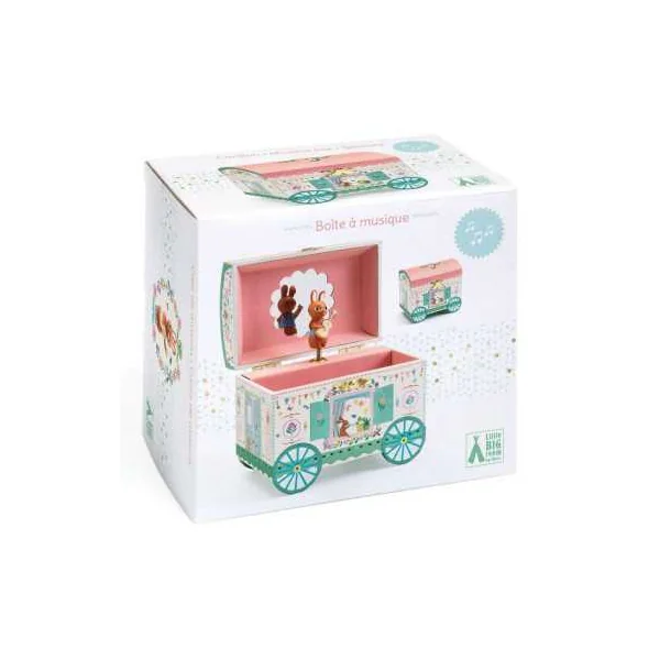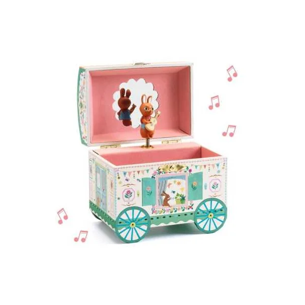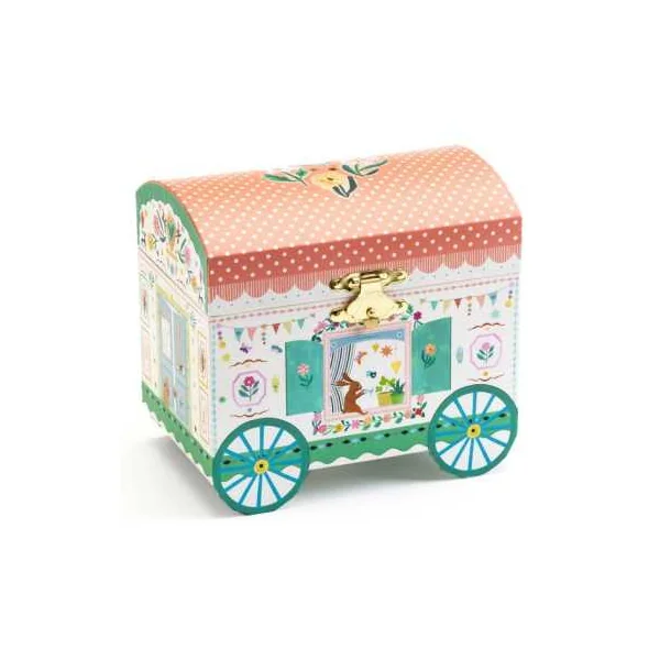 Découvrez la boite à bijoux Roulotte enchantée de Djeco, une boite à musique et un coffre à bijoux en forme de roulotte joliment illustrée pour ranger ses bijoux et secrets.