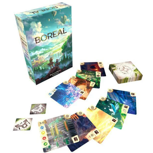 Dans Boreal il vous faudra gérer habilement vos ressources et poser les meilleures cartes dans votre pyramide pour cumuler plus de points de victoire que votre adversaire. 1 plateau – 2 pions EXPLORATION – 44 cartes, réparties comme suit – 12 cartes LIEU DE DÉPART- 24 cartes LIEU – 8 cartes ARCHIVE – 1 livret de règles – 1 aide de jeu-