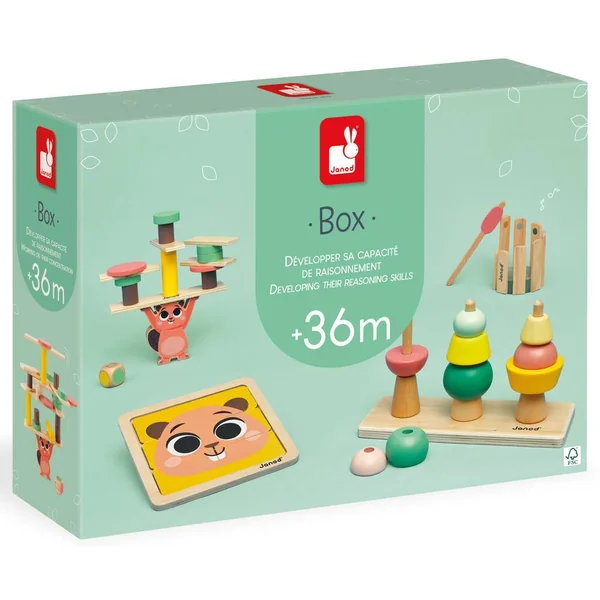 Lancez-vous dans l’aventure Janod Box, une box complète composée de 4 jouets adaptés à l’éveil de votre enfant. Développée en collaboration avec une psychomotricienne, elle accompagne votre enfant en douceur dans son développement psychomoteur et ses futures acquisitions. Votre enfant découvrira son premier abaque, un jouet d’adresse Super castor, le carillon de la mare ainsi qu’un puzzle des émotions. Ces 4 jouets en bois et en carton ont chacun une fonction différente pour stimuler votre enfant. Pour vous accompagner dans l’utilisation de cette box, vous retrouverez un dépliant détaillé avec des informations concernant les axes de développement d’un enfant de 36 mois, mais également des explications sur les jouets ainsi que leurs objectifs pédagogiques. Janod Box, ce sont 4 box (12 mois, 18 mois, 24 mois, 36 mois) qui ont été imaginées afin de proposer à votre enfant des jouets en adéquation avec son développement en fonction de son âge. Jouet d’éveil en bois et carton FSCTM pour les enfants à partir de 36 mois.