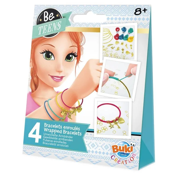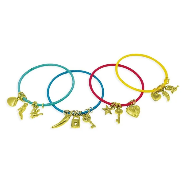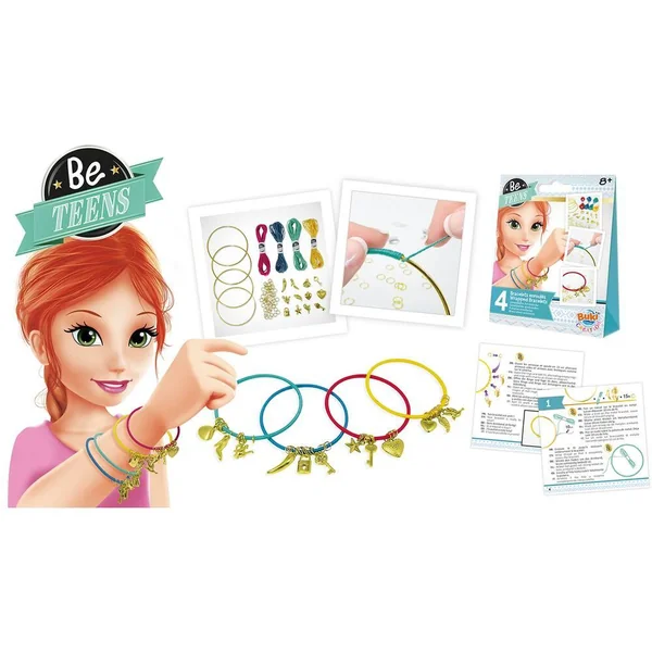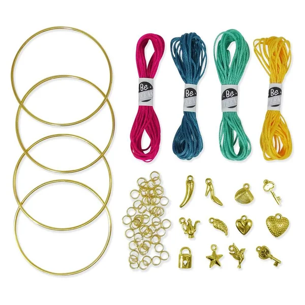 Enroule les fils de coton, ajoute anneaux et breloques pour des bracelets colorés ! Ce coffret contient : 4 bracelets en métal, 4 couleurs de fil de coton, 60 anneaux, 12 breloques. Notice illustrée en couleurs.