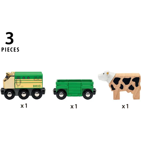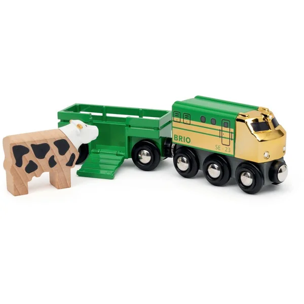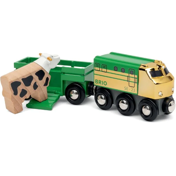 Basée sur le célèbre train de la ferme, cette locomotive est proposée dans une jolie couleur verte avec des fintions dorées. Il y a aussi un wagon pour les animaux avec de l’espace pour une vache en bois très spéciale : ses cornes sont dorées. Repliez la rampe, grimpez à bord et c’est parti. Dès 3 ans À propos de BRIO World : BRIO World est notre système de jeu ouvert qui grandit avec votre enfant. Tous les jouets BRIO World, de nos rails à nos véhicules et personnages, sont compatibles entre eux et permettent ainsi de créer un monde entièrement personnalisable, idéal pour stimuler les esprits en pleine croissance. Les combinaisons de jeux sont infinies et n’attendent plus que vous pour les explorer et ce train en édition spéciale est le parfait ajout à tout circuit de train BRIO World. Contenu : 1 train de la ferme en édition spéciale, 1 wagon pour animaux, 1 vache en bois.