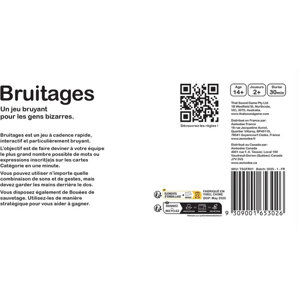 Saurez-vous vous faire comprendre sans mots ni mains ? Faites deviner un max de mots grâce à vos bruitages, dans ce jeu d’ambiance hilarant et bruyant ! Bruitages est un jeu d’ambiance qui s’explique en 30 secondes : l’objectif est de faire deviner à votre équipe le plus grand nombre possible de mots ou expressions inscrits sur les cartes Catégorie en une minute. Vous pouvez utiliser n’importe quelle combinaison de sons et de gestes, mais devez garder les mains derrière le dos.