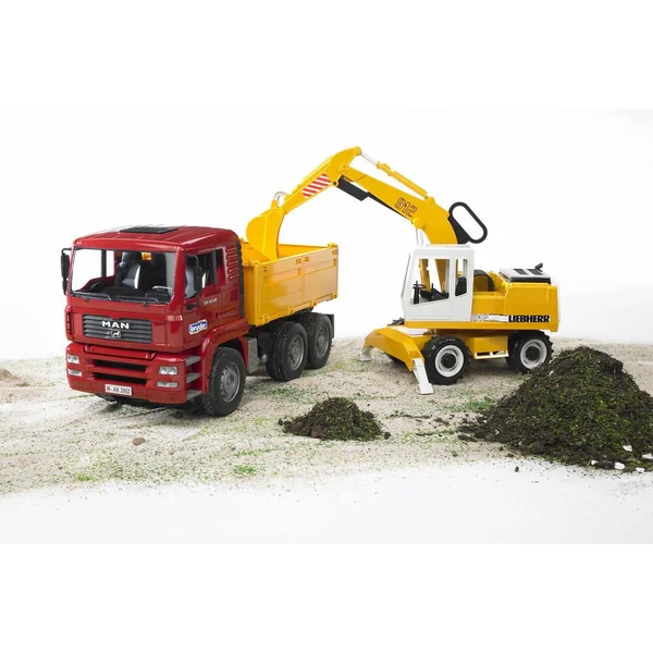 Echelle 1/16ème. Camion benne avec cabine inclinable et toit ouvrant. Les ridelles de la remorque sont amovibles et celle-ci est inclinable. Dimensions du camion : 41.5 x 17.5 x 21.5 cm. La pelleteuse Liebherr dispose d’une rotation à 360°. Le bras avant de la pelleteuse est fonctionnel grâce à la poignée et permet de ramasser du sable ou des graviers (non fournis). Dimensions de la pelleteuse : 39 x 15.5 x 22 cm. En plastique.