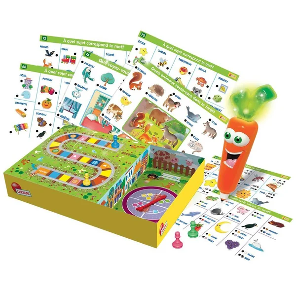 Carotina 1000 Questions propose un programme complet d’apprentissage progressif avec 47 fiches recto verso d’ activités didactiques interactives. Quand vous répondez correctement, le stylo s’illumine et vous félicite en s’exclamant joyeusement. La boite contient également un amusant jeu de l’oie qui convient aux enfants plus jeunes. Taille du plateau de jeu : 30 cm x 28 cm.
