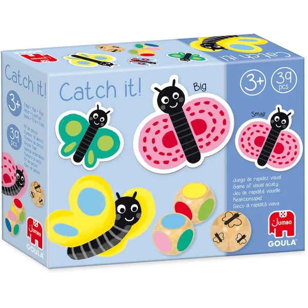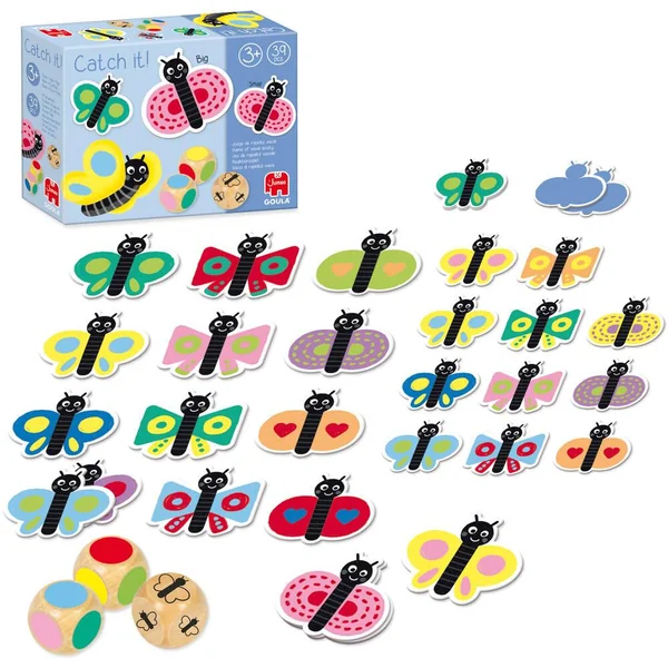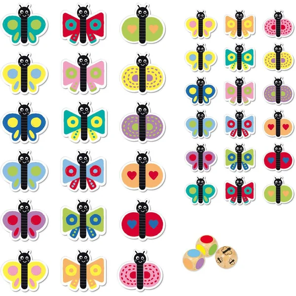 Lance les 3 dés et trouve la combinaison correcte (taille et couleurs des motifs). Joue aussi au memory en retrouvant le grand et le petit papillon qui ont le même motif. Contenu : 3 dés de bois et 36 jetons.
