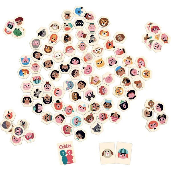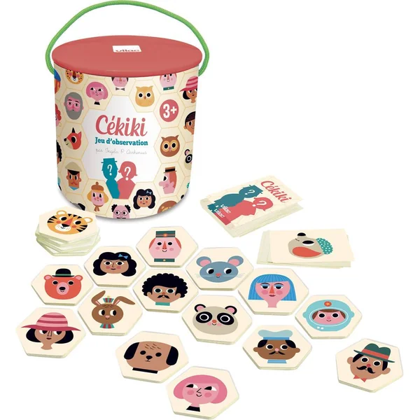 Le Cékiki, c’est pas 1 mais 2 jeux ! • Le Cékiki, c’est un jeu de déduction : parmi toutes les pièces en bois, trouverez-vous le personnage que l’autre a pioché ? A-t-il des moustaches ? Des cheveux blonds ? Est-ce un animal ? De nombreuses possibilités parmi les 100 personnages dessinés par Ingela P. Arrhenius s’offrent à vous. Serez-vous le plus malin pour trouver la solution avant l’autre ? • L’autre règle du jeu du Cékiki est un jeu d’observation et de rapidité : on tire une carte et il faut être le plus rapide pour trouver la pièce en bois correspondante au milieu des 99 autres… ambiance assurée et gare aux pièges !!!