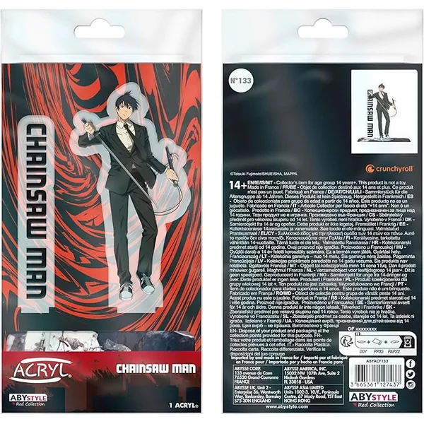 Ce stand acrylique est un ajout incontournable pour orner votre bureau, votre étagère ou un espace dédié à l’univers de Chainsaw Man. La base robuste, marquée du logo Chainsaw Man, ajoute une touche d’authenticité et d’intensité à votre décoration. C’est un cadeau idéal pour tout collectionneur ou fan de la série, capturant parfaitement l’essence de l’univers sombre et brutal dans lequel Aki évolue.