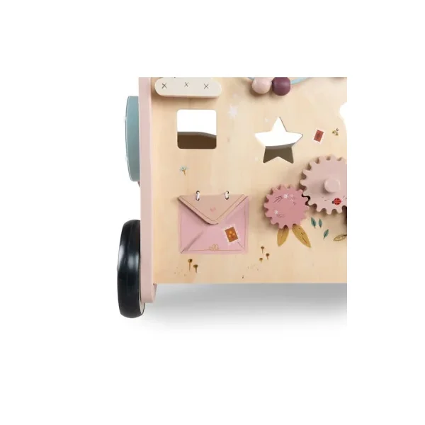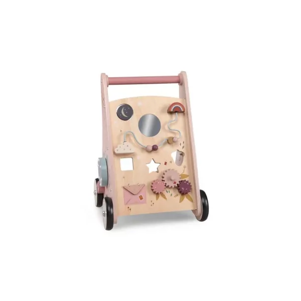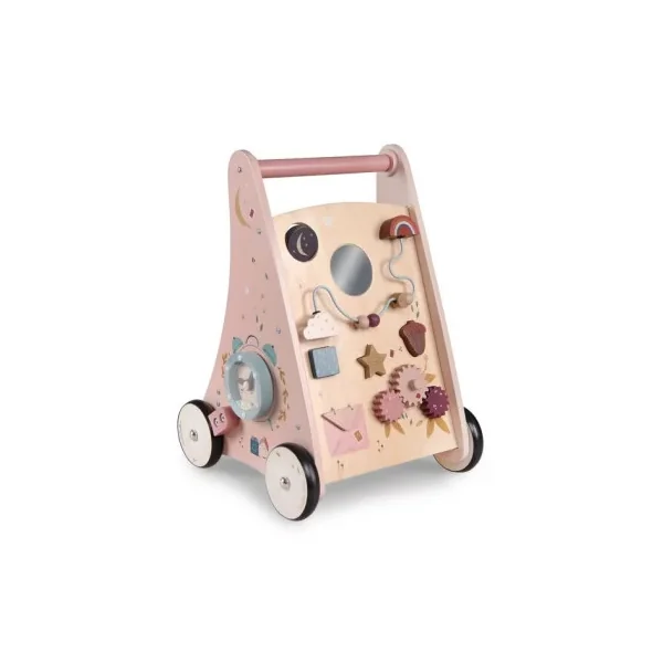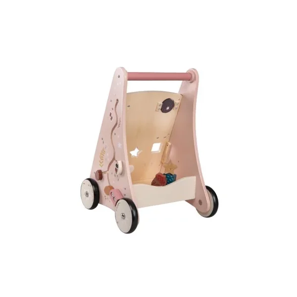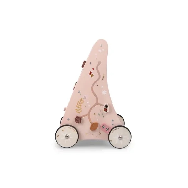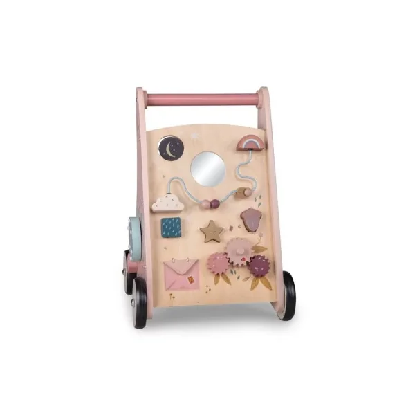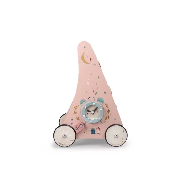 Un chariot de marche antidérapant pour accompagner les premiers pas de bébé en toute sécurité. Décoré des illustrations poétiques de Lucille Michielli sur la nature, il dispose de 8 activités: labyrinthe coulissant, engrenages, formes à encastrer, boulier…
