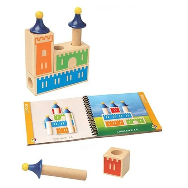But du jeu : Trouver la bonne position des pièces en bois pour réaliser le chateau demandé Niveau : 48 défis, 4 niveaux de difficulté, à partir de 3 ans.