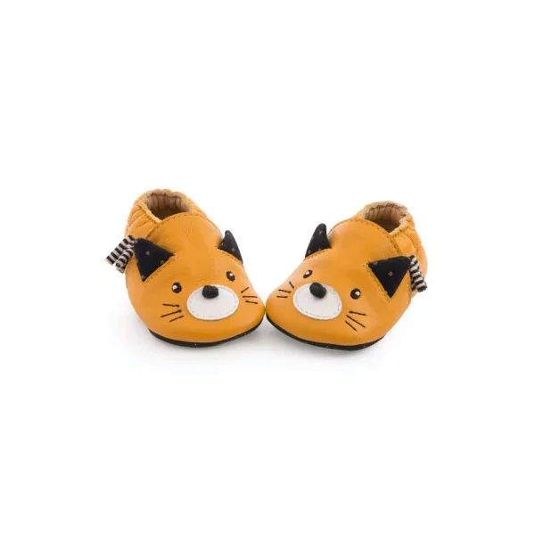 Découvrez les chaussons en cuir chat moutarde taille 0-6 mois de la collection Les moustaches de Moulin Roty, des chaussons 100% cuir, souples, doux et confortables, parfaits pour protéger les petons de bébé de la naissance à 6 mois.