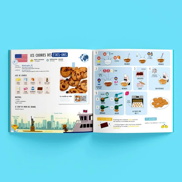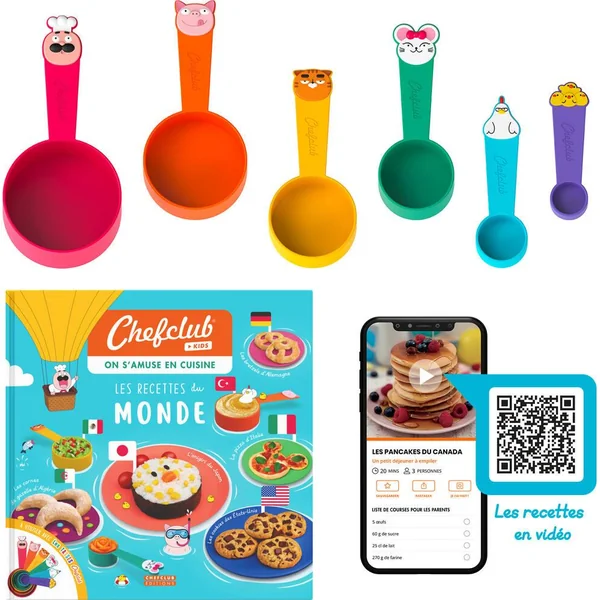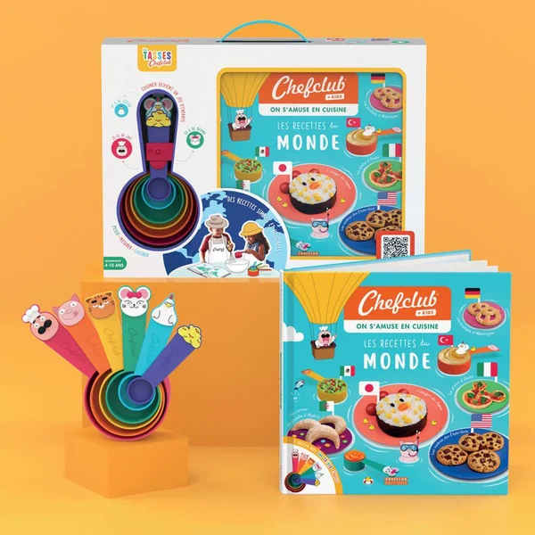Faites voyager les enfants grâce à plus de 20 recettes emblématiques des 4 coins du monde. Les petits chefs peuvent suivre les illustrations des recettes pour cuisiner en toute autonomie avec les Tasses Chefclub fournies dans le coffret. Des recettes simples et créatives illustrées en pas-à-pas avec les Tasses Chefclub fournies dans le coffret. Un livre de recettes et un atlas à la fois. Des pages imperméables et lavables. 1 poster du monde et 1 planche d’autocollants rigolos. Toutes les recettes disponibles en vidéos via des QR codes faciles à scanner.