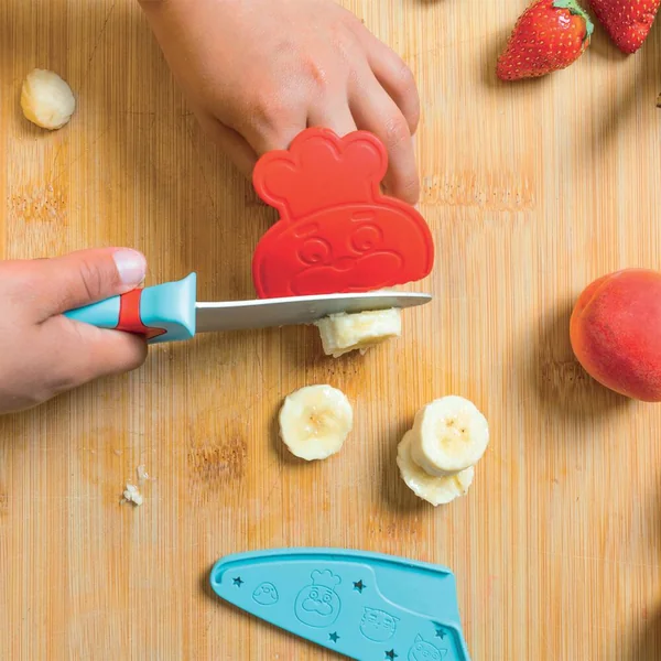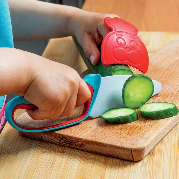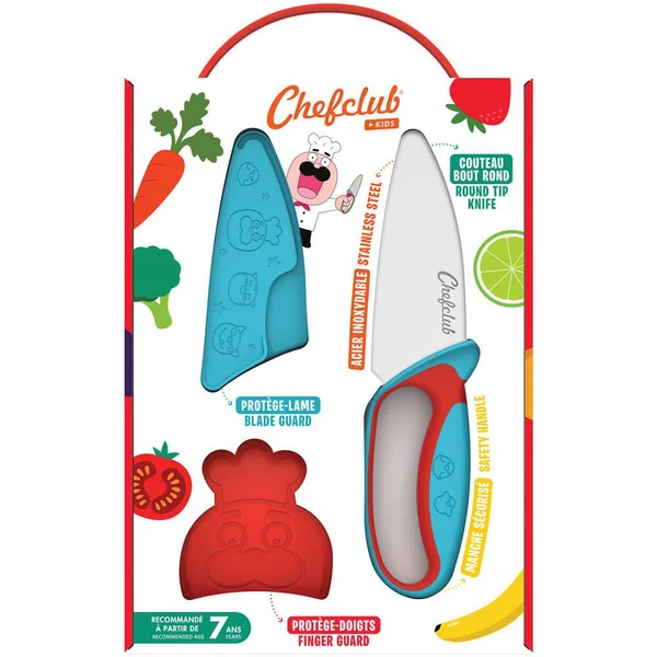 Les enfants peuvent enfin couper les aliments en toute sécurité ! Le couteau Chefclub Kids est composé d’un manche ergonomique conçu pour offrir une excellente prise en main aux petits cuistots droitiers ou gauchers, un protège doigts adapté à la taille des doigts des enfants et une lame au bout rond pour plus de sécurité. Un couteau de cuisine innovant adapté aux besoins des petits cuistots. Un protège doigts sécurisant pour la main qui tient l’aliment. Un protègelame pour un rangement sans risque de coupures.