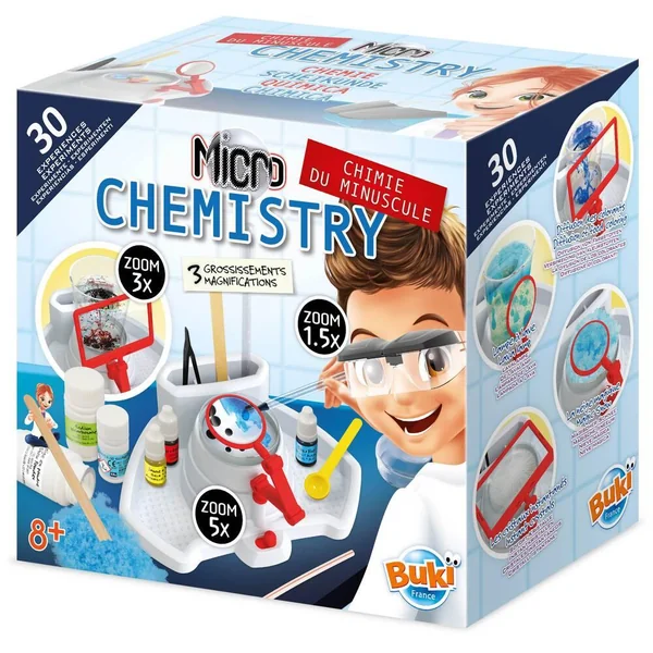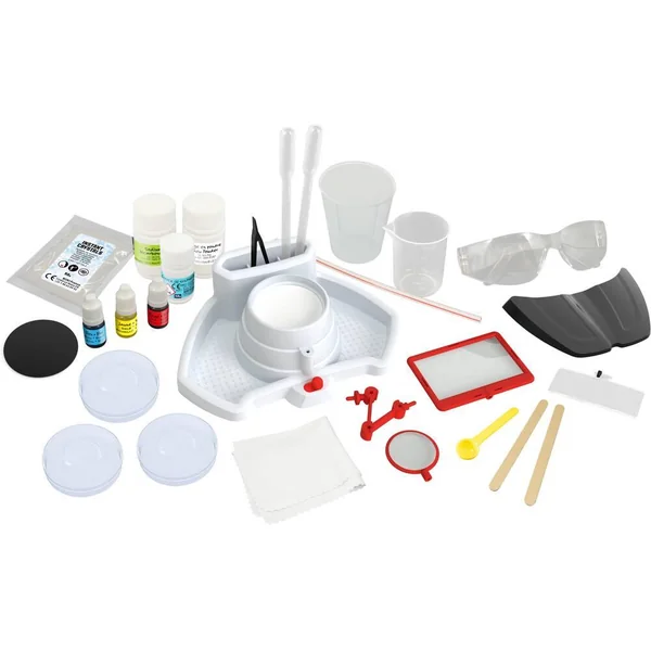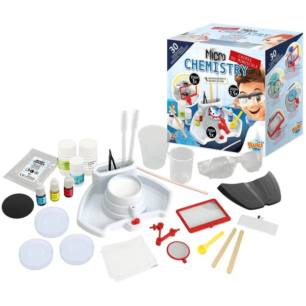 30 expériences pour se plonger dans le monde incroyable du minuscule Le coffret contient des lunettes grossissantes (x1,5) et une station éclairée avec une loupe sur bras articulé (x3) et une large loupe (x5) Nombreux accessoires inclus: pipettes, seringue, pince, aiguille, boîtes de Petri, réactifs (colorants, poudre à cristaux.)