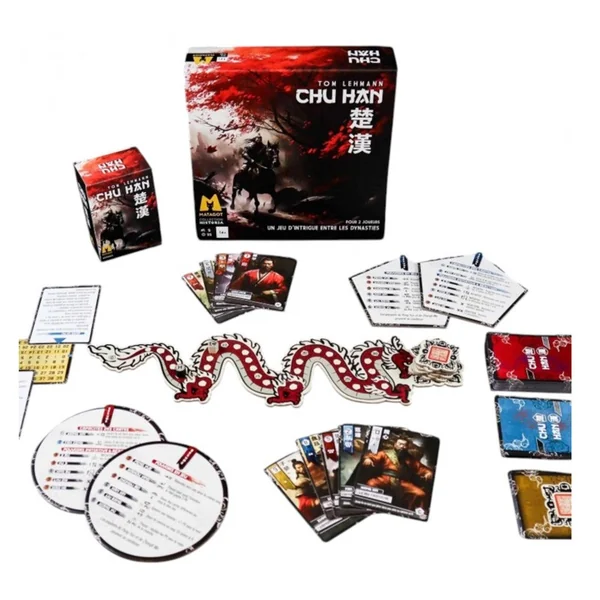 Le Chu Han est un jeu de ruse, d’escalade et d’élimination qui se compose de plusieurs mains. Les joueurs commencent chaque main avec un mélange de cartes Chu et Han, représentant les tensions au sein des clans, les prises d’otages et les changements d’allégeance. Des événements optionnels et deux campagnes historiques apportent une variété supplémentaire.